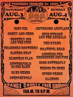 Harvey "Humble Harve" Miller, a Top 40 disc jockey for 93 KHJ-AM in Los Angeles, was hired to promote the show and hosted the event with Wavy Gravy. Wesco Productions (West Coast Productions) consisted of Mark Robinson, Gary Schmidt and Al Schmidt, though Humble Harv was used in advertising for promotional purposes. Tom Neito of Scenic Sounds Productions also assisted in securing the fairgrounds, and was paid a fee and received some promotional billing. Robinson had been involved with Bob Blodget in staging a much smaller but similar weekend festival in 1967 in Los Angeles.[2] There never was a second edition of this event and its prominence faded from memory until, on August 4, 2008, Jeff Overley penned a feature article for the Orange County Register[3] that commemorated the event's 40th anniversary.
