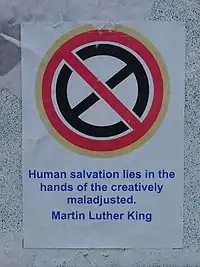 The "I Have a Dream" (Martin Luther King) mural, painted over two nights in August 1991, is the largest, most prominent, and the longest-surviving of the many large format murals created around Newtown by the team known as Unmitigated Audacity Productions, the core members of which were New Zealand-born Canadian artist Andrew Aiken and his colleague Juilee Pryor. They were assisted in this mural by Tony Spanos, who provided a cherry-picker to allow the upper part of the mural to be painted.[9] It commemorates American civil rights leader Dr Martin Luther King Jr. One of the last surviving large-format murals in the area, it displays a large portrait of Dr King, next to a large painted depiction of the Apollo 8 photograph of the Earth from space, and quotes Dr King's 1963 "I Have a Dream" in large Gothic lettering, near which is the quotation from Genesis 37:19: "Behold the dreamer cometh; Come now therefore and let us slay him, and we shall see what will become of his dreams".