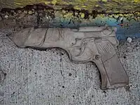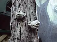 - The concrete graffiti style uses objects cast in concrete or a similar material, which are often glued into place on a footpath or against a wall. Around Newtown, many of these objects appear to have been created by the same artist, Will Coles, as a commentary on consumer culture. They have often been in the form of familiar items such as televisions and TV remote controls, and feature inscribed single-word slogans such as "fear" or "hate". These largest of these objects are the installations on King Street and on the corner of Gladstone Street, Enmore; both are full-scale replicas of a medium-size CRT television mounted on top of a replica VCR. The King Street object (now defaced by marker tags) is inscribed with the slogan "life is fleeting" and the Gladstone Street object with the word "obsolescence". Other concrete graffiti objects (such as those pictured above in May Street, St Peters) are partial representations of human-like faces, which appear to be based on medieval gargoyles.[16][17]