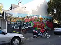 Since the 1980s, the area surrounding the Sydney inner west suburb of Newtown, Australia, including the suburbs of Newtown, Enmore, Erskineville, Camperdown and St Peters, has been known for its wide range of prominent graffiti and street art on walls. [1] The public visual art in the Newtown area consists of a variety of styles and methods of execution, including large-scale painted murals, hand-painted (or sprayed) political slogans, hand-painted figurative designs, spray painted semi-abstract designs (including large-scale and elaborate semi-pictorial) "tags"), and other stylistic developments such as stencil art and street poster art (also known as "wheatpasting"), "Yarn bombing", and sculptural items cast from plaster and other materials.[2]