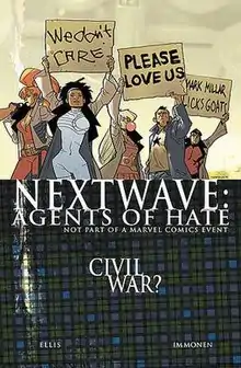 Nextwave is a humorous comic book series by Warren Ellis and Stuart Immonen, published by Marvel Comics between 2006 and 2007. Nextwave consistently features extreme violence and comedy, and simultaneously satirizes and celebrates Marvel's superhero comics. The series frequently uses flashback scenes in which existing Marvel characters such as Captain America, Ulysses Bloodstone and the Celestials act grossly out of character for comedic purposes. In an interview, Ellis said: "I took The Authority and I stripped out all the plots, logic, character and sanity.[1] It's an absolute distillation of the superhero genre. No plot lines, characters, emotions, nothing whatsoever. It's people posing in the street for no good reason. It is people getting kicked, and then exploding. It is a pure comic book, and I will fight anyone who says otherwise. And afterwards, they will explode".[2]