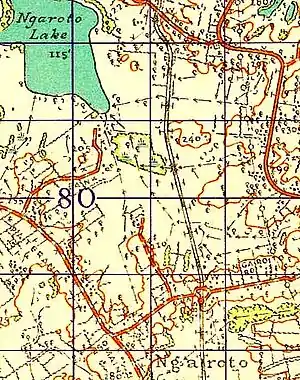 Ngaroto railway station was a station on the North Island Main Trunk in New Zealand, 3.42 km (2.13 mi) south of Lake Rd,[2][3] 2 mi (3.2 km) north of Te Awamutu,[4] beside the entrance to Yarndley's Bush. Lake Ngaroto is visible from the railway to the north of the station.