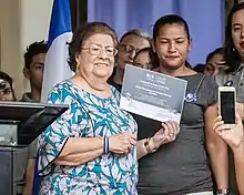 Vilma Núñez accepts a certificate of recognition on behalf of CENIDH from the Mothers of April Association in December 2019