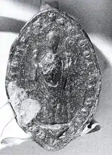 Kőszegi was unanimously elected Bishop of Győr by the local cathedral chapter between May and October 1308, following the death of his predecessor Theodore Tengerdi.[7] Despite the opinion of some scholars and former almanacs,[3] his election took place without any direct pressure from the Kőszegis. Contemporaries, including papal legate, Gentile Portino da Montefiore did not question the legitimacy of his election in the upcoming years, albeit it could be a sign of political flexibility.[8] Historian György Rácz argued Nicholas' election was "one of the chapters of the power gaming" between Charles and the Kőszegis.[9] Nicholas spent the following months in the escort of the papal legate, who arrived to Buda by 2 November 1308. Kőszegi attended the Diet on 27 November 1308, when Charles was unanimously proclaimed king. He also participated in the second coronation of Charles on 15 June 1309, also representing his family.[10] His papal nomination promoted only after the treaty between Charles I of Hungary and Henry Kőszegi on 4 June 1309 (Ivan Kőszegi died by then), when members of the family, including Bishop Nicholas, took an oath of allegiance to the king. One of Henry's conditions for the king's acceptance was the retention of bishopric of Győr for the family through his natural nephew, Nicholas.[11] As a result, Charles and Gentile sent Nicholas Finta, the chancellor and representative of Nicholas Kőszegi to the papal court in early 1310, in order to request his confirmation.[12] Thereafter, Pope Clement V confirmed his election on 28 July 1310,[7] describing Kőszegi as solutus and soluta, i.e. natural son of free and unmarried men, a 28-year-old clergyman. The pope also determined his servitium commune in 800 golden florins.[13] Sometime between March and July 1311, Kőszegi was consecrated as bishop by Thomas, Archbishop of Esztergom,[14] upon the order of Pope Clement.[15]
