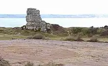 The stack's intended purpose is uncertain. Some believe that it was left as a seamark, while other suggest it was a memorial to the efforts of those who moved so much stone from the site, or that it was simply to highlight the amount of stone quarried, thereby recording the natural ground level.[3] Near to Nicodemus Knob are a number of small fields, enclosed by drystone walls. Adjacent to the stack are some flat rectangular areas once used by Portland Port Ltd as an industrial storage site.[4] The area is noted as being "botanically rich", while migrant birds are frequently spotted in the area.[5]