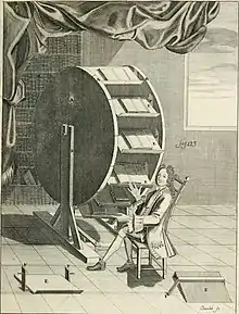 Grollier de Servière, a cousin of Jean Grolier de Servières (1489/901565), Treasurer of France and famed bibliophile, was born in Lyon, the fourth son of Antoine Grollier de Servière[1] and in his youth followed a military career that took him to Flanders, Germany, Italy and Constantinople; as an engineer, he specialized in deploying movable bridges in the field. After he retired to his home in Lyon, he worked on ornamental lathe-work and built a series of fantastic models. He displayed his work in a cabinet that he opened to the public once a week and which became famous enough to attract politicians, scholars, artisans and other inventors. It featured model water pumps and Archimedes' screws, siege engines, designs of floating bridges and clocks regulated by balls travelling down inclined planes or along spiral tracks, machines to trace landscape and to convert plan images into perspective, odometers with reducing gears, wheelchairs, many intricate pieces of lathe-work in ivory and wood, and an improved version of Agostino Ramelli's reading wheel that allowed many books to be read by means of a rotating wheel. Eventually even Louis XIV paid a visit to Grollier de Servière.