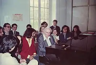Conservatoire national supérieur de Paris: The composition class of Olivier Messiaen, June 1978; on the left side, Panagopoulos and on the right side Messiaen on the last day of his career in the Conservatory