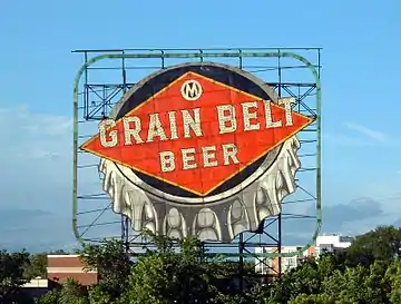 From the 1910s, Nicollet Island and the rest of the Gateway District declined, and the flats and houses on Nicollet Island were subdivided to create cheaper housing.[18] The island became a poor neighbourhood, owned by a few landlords, who provided little maintenance to its residential buildings. The family of Morris Lerner came to own much of the island, and ran the Island Grocery there. The Lerners were described as generous by sometime tenants and ran their store at a loss, but were described as slumlords by disgruntled tenants and the city newspapers.[19] During the 1960s, David Lerner entered into a long and public dispute with Nicollet Island residents who formed a tenants union. The tenants picketed outside his store and his home on Cedar Lake, and in response Lerner told a newspaper that his tenants were either "nice ones" or "pigs", citing the poor condition his tenants left his properties in.[20] In the 1940s, the iconic Grain Belt Beer sign was erected on the island, at the time one of the largest neon signs in the country. DeLaSalle expanded over the 20th century, demolishing and building on the site of the Eastman Flats. It became a college preparatory school, and went coeducational in 1971 by absorbing a Catholic girls' school.[21]