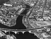 Starting in the 1950s, northern downtown was redeveloped by the city and state government, which made numerous plans to redevelop the island. Most proposals involved razing the historic buildings of the island, and in many cases replacing them with new buildings such as high-rise apartments.[8][18] In addition to various housing developments, proposals included a parking lot, an amusement park, a "historic village", and a conservation museum. City agencies favored using the island to increase recreational space near Downtown.[22][23] Island residents resisted any change. In the 1970s, the island became a concern of preservationists and was included with the rest of the Saint Anthony Falls district on the National Register of Historic Places.[18]