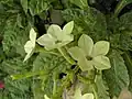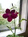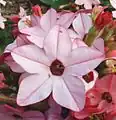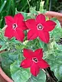 Nicotiana × sanderi,[4] also known as Nicotiana × sanderae, is a hybrid of the tobacco species Nicotiana alata (syn. N. affinis) and Nicotiana forgetiana (syn. N. rubra).[2][5] It is the most common ornamental Nicotiana variety found and sold in the United Kingdom. Nicotiana × sanderi requires soft soil mixed with sand to thrive. The plant will grow to heights of 3 feet (0.91 m) and will give off a sweet scent in the evening, like most Nicotiana plants. Nicotiana × sanderi is not hardy against frost and will die if it comes in contact with it; however, it withstands drought. Because of its size, N. × sanderi is used as a house or garden plant.