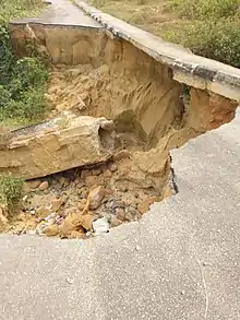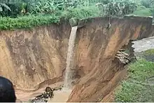 Gully erosions occur due to sandy soil being unable to withstand the runoff and eventually eroding away, leaving gaping gullies that swallow homes and other infrastructure. Gullies and areas exposed to erosion in South Eastern Nigeria tripled from about 1.33% (1,021 km2) in 1976 to about 3.7% (2,820 km2) in 2006, making the region the most affected in the country.[2][3]