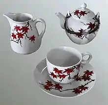 Coffee pot and cups in red maple leaves design was used at the time of opening