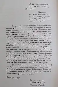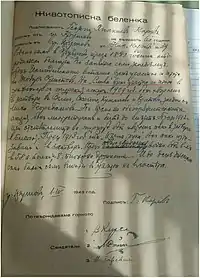 His two brothers, Petar and Georgi also participated in IMRO.[26] During the First and the Second World Wars, when Vardar Macedonia was annexed by Bulgaria, they supported the Bulgarian authorities.[27] After World War I, both were abused when the area was returned to Serbian administration. During the Second World War, Georgi was a Mayor of Krusevo. After 1944 they were imprisoned as Bulgarian fascists' collaborators in Communist Yugoslavia, where both died in the internment camp of Idrizovo in 1950 and 1951 respectively.[28] Nikola's nephew Mihail, the son of Georgi, was also imprisoned on a charge of "opposing the idea of Communist Yugoslavia".[29]