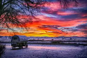 Covered wagon at sunset