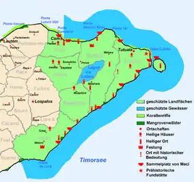Over 200 cultural sites have been identified within the national park. The settlements in the park are inhabited by Fataluku people who speak a linguistically-distinct language and consider themselves to be ethnically distinct from those who do not speak their language.[4] The Fataluku have many ritualistic sites (lupurasa) within the park. Nino Konis Santana National Park contains many rock art sites,[13] with paintings on walls of limestone terraces and also in caves, as well as a rock engraving site. Printed sacred cloth with some of the rock art forms is exchanged during marriage ceremonies. These art forms are also seen carved on ratu houses and on Catholic headstones.[14] Many rock shelters and caves with ancestral figures of heritage value have also been recorded in the park, apart from ancient walled and open settlements, shell middens, artifacts of pottery made of stone and shells, burial sites, and water sources.[14]