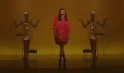 A screenshot of a scene in the music video of "Nirvana", portraying Inna in a gold box accompanied by two women with their arms out. A critic interpreted it as Egypt-inspired.[7]