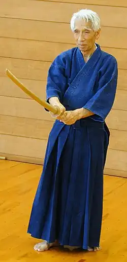 Nishioka Tsuneo started his training in Shinto Muso Ryu (神道夢想流) under Shimizu Takaji (清水隆次) in 1938 at the age of 14. Nishioka studied constantly with Shimizu Takaji until Shimizu’s death in 1978. Nishioka received his first scroll of transmission (Oku-iri) in 1941, the second (Shomokuroku) in 1943 and (Gomokuroku) in 1966. In 1975 Nishioka received his Menkyo Kaiden or "license of full transmission" from Shimizu Takaji. [1]