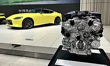 The Nissan Z (base Sport trim known as Fairlady Z Version S in Japan) uses the same VR30DDTT engine from the Infiniti Red Sport 400 models (known as the Nissan Skyline 400R V37 in Japan), and the same Nissan FM Platform from previous two generations of the Z. The VR30DDTT is a 3.0-liter twin turbocharged V6 engine generating a maximum power output of 298 kW (400 hp; 405 PS) at 6400 rpm and 475 N⋅m (350 lb⋅ft; 48 kg⋅m) of torque at 1600 to 5600 rpm with a redline of 6800 rpm. The engine also features direct injection and variable valve timing, running up to 14.7 psi (101 kPa) of boost. Manual transmission models get a carbon-fibre driveshaft, an EXEDY performance clutch, and automatic transmission models get a rev-matching system on downshifts and aluminum paddle shifters.[17][18]