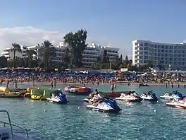 Nissi Beach has become a popular destination for clubbers following live programs transmitted through BBC's Radio 1 Roadshow during the summer tourist season since 2002. Nissi Bay Beach Bar is very popular with locals and tourists alike, playing music throughout the day and organizing events such as foam parties and catwalks with guest DJs.[2][3] Water sports such as water-skiing and windsurfing are available. There are also two beach volleyball courts open to the public.[4]