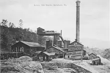 The preliminaries to the furnace's construction began in 1885, when Valentine and Thomas, an old ironmaking firm of Bellefonte, decided to sell off its properties. These then consisted of Bellefonte Forge, on Logan Branch just south of Bellefonte, and Bellefonte Furnace, a cold blast charcoal iron furnace lying about a mile south of the town, also on Logan Branch,[1] as well as holdings in local iron ore mines. Both plants were served by the Bellefonte, Nittany and Lemont Railroad, a subsidiary of the PRR. The ironworks and ore lands were bought on August 2, 1886, for $400,000, by the Valentine Ore Land Association,[2] whose principals organized the Centre Iron Company to erect a new iron furnace on the site of Bellefonte Furnace, which was to be torn down. A $600,000 mortgage was immediately raised on the properties, to supply the purchase money and funds for rebuilding the furnace.[2] The leaders of the company included Edmund Blanchard, W. M. Stewart, and B. K. Jamison, a Philadelphia banker.[3] The plant was built in 1887,[4] and the Nittany Valley Railroad was built to supply it with ore. It became necessary to raise additional funds, and in 1887, the Pennsylvania Railroad purchased $75,000 worth of bonds in exchange for exclusive rights to rail traffic to and from the furnace. The first load of ore was delivered by the Nittany Valley on February 28, 1888, and the furnace went into blast on March 4, 1888.[5] The company was originally headed by Jamison,[6] but by 1890, James B. Coryell was president and Jamison vice-president. At this time, the furnace had one 70-foot (21-meter) stack and three hot-blast stoves, with a capacity of 30,000 tons (27,200 tonnes) of iron per year. Ore was supplied from local hematite deposits, and the furnace was fuelled by Connellsville coke.[4] In the same year, however, the failure of Jamison's bank precipitated the closure of the furnace by the sheriff on November 15, 1890. It was subsequently sold under foreclosure.[7]