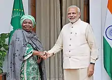 In January 2012, while still heading the Ministry of Home Affairs, Dlamini-Zuma contested the position of Chairperson of the African Union (AU) Commission. In doing so, she broke an "unwritten rule" that major African powers do not put forward candidates for AU positions.[30][31][32] This angered many AU states, leading to a deadlock in the first election,[31][33] despite the backing for Dlamini-Zuma's presidency provided by the fifteen states comprising the Southern African Development Community.[23][34] As a consequence of the failure to secure a two-thirds majority of the vote, incumbent Jean Ping's term was extended by six months,[35][36] until a second election on 15 July at the nineteenth session of the AU Assembly elected Dlamini-Zuma to the position.[37][38] The vote was largely divided along language lines – Francophone states against Anglophone states, with the latter bloc supporting Dlamini-Zuma's candidacy.[23][39] Dlamini-Zuma was Chairperson until 30 January 2017, when she was replaced by Chadian Foreign Minister Moussa Faki.[40]
