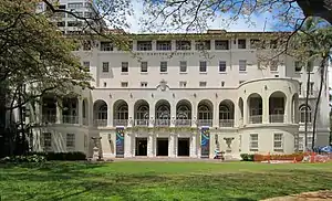 While they were both in the cabinet, under King Kamehameha V, American politicians John Mott-Smith and Charles Coffin Harris convinced the legislature to fund a hotel. Hawaii’s first hotel, the Hawaiian Hotel, opened in 1872.[4]:173–174 Renamed the Royal Hawaiian Hotel, it was converted to a YMCA in 1917 and used by the military in World War I.[5] In 1926 the termite-infested building was torn down, and a new one designed in Spanish mission style by Lincoln Rogers of the firm Emory & Webb.[6][7] The two-story U-shaped building, dedicated on March 16, 1928, included a swimming pool in its courtyard.[8]