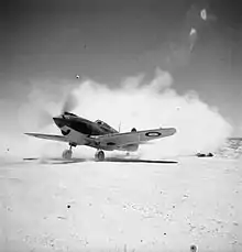 On 1 April 1941, No.250 reformed at RAF Aqir from K Flight as No.250 (Sudan) Squadron and by the end of the month had received enough Tomahawks to become operational on defensive duties in Palestine.[3] In May, a detachment began offensive sweeps over Syria and in June began operations in the Western Desert, being withdrawn in February 1942 for defensive operations.[4] After converting to Kittyhawks, it returned to the desert in April as a fighter bomber unit and provided support for the 8th Army, advancing with it through Libya into Tunisia to end the North African campaign. In July 1943, the squadron flew to Malta to support the landings in Sicily moving there a few days afterwards.[5] By mid-September it had occupied airfields in Italy where it spent the rest of the war flying fighter bomber missions. In August 1945, No.260 Squadron disbanded and transferred its Mustangs to No.250 which then flew them until disbanded on 30 December 1946 at Treviso, in Italy.[6]