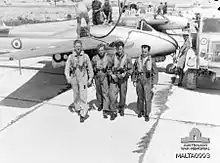 The squadron was re-formed at Williamtown on 24 January 1949 equipped with de Havilland Vampire jet fighters.[35] From 1949 to early 1952 No. 75 Squadron conducted training exercises, which included teaching new pilots to operate Vampires, as well as making acceptance flights of Vampires delivered to the RAAF.[36] During this period a key role for the squadron was training pilots for combat in the Korean War with the Gloster Meteor-equipped No. 77 Squadron.[37] In March 1952 the Australian Government decided to reform No. 78 Wing and deploy it to Malta where it would form part of a British force which sought to counter the Soviet Union's influence in the Middle East. No. 75 and No. 76 Squadrons were selected to form the wing's flying units, and they arrived at RAF Hal Far in Malta during July 1952 and were equipped with Vampires leased from the Royal Air Force (RAF). While based at Malta the wing took part in numerous training exercises in the Mediterranean region as well as Europe, including a large-scale NATO exercise in 1953 which involved 2,000 aircraft and 40,000 personnel. In addition, the wing participated in a royal review to commemorate the coronation of Queen Elizabeth II. No. 78 Wing moved to the RAF station at Ta' Qali in June 1953 where it remained until it returned to Australia in late December 1954. In preparation for its return to Australia No. 75 Squadron was disbanded in November 1954.[24][38]
