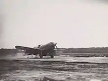 From May 1945 No. 75 Squadron participated in the Borneo Campaign. While the squadron's ground crew landed on Tarakan with the invasion force in early May 1945, delays with repairing the island's airfield meant that its aircraft could not be deployed there until mid-July rather than 3 May as had been originally planned. During this period No. 75 Squadron's pilots remained at Morotai but conducted little flying, causing their morale to decline.[32] Once established at Tarakan the Kittyhawks attacked targets near Sandakan and supported Australian forces during the Battle of Balikpapan in the war's last weeks.[33]