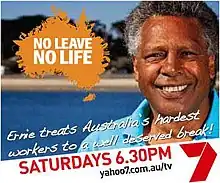 No Leave, No Life is an Australian lifestyle television series, hosted by Ernie Dingo in season 1, James Tobin in season 2 and Tim Ross in its third season. The program features a celebrity guest presenter each week surprising ordinary Australians with a holiday, and the destination is then profiled. Another celebrity, often a comedian, then fills in for them at their work while they are away.[1] The title of the show, "no leave, no life" was an Australian tourism campaign slogan.