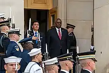 In October 2020, Kishi released a joint statement with Australian Minister of Defense Linda Reynolds that announced that Japan's Self Defense Forces would be enabled to protect Australian military assets, an act which was made legal in September 2015 through the "Peace and Security Preservation Legislation" passed under the Abe administration. This makes Australia the second country (after the United States) whose assets Japan would be permitted to protect.[8] Kishi and Reynolds also emphasized their opposition to "any destabilizing or coercive unilateral actions that could alter the status quo and increase tensions in the East China Sea," and some analysts have speculated this to be in reference to Chinese maritime activities around the Senkaku Islands.[9] In a September 2021 interview with the Mainichi Shimbun, Kishi stated that Japan cannot stand aside when events occur in Taiwan due to being close neighbors and allies with shared universal values such as freedom and democracy.[10] In 2021, he visited the controversial Yasukuni Shrine, making him the first sitting Defense Minister to do so since 2016. In response, the South Korean Foreign Ministry described his visit as "deplorable".[11]