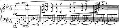The opening section moves into a contrasting middle section in the same key signature, which flows back to the opening material in a transitional passage where the melody floats above seventeen consecutive bars of D♭ major chords. The reprise of the first section grows out of this, followed by a Picardy third ending.