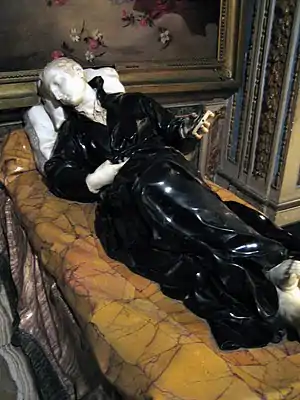 dressed in a habit of noir belge which effectfully offsets the white Carrara marble of the head, hands, feet and pillows.