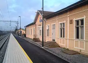 The Nokia railway station is located in the town of Nokia, Finland, on the track between Tampere and Pori. The station was completed in 1895, and trains between Tampere and Pori stop there twelve times a day, half of which in each direction. A train trip between Tampere and Nokia takes 14 minutes, according to the VR Group. There is a bus station in connection with the railway station, including a Matkahuolto cargo terminal, a taxi station, a café-kiosk and a business complex, containing a police station and a waffle café.