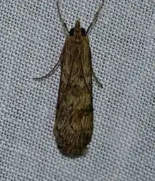 The wingspan is 24โ35 mm. When at rest, adults keep their wings overlapped and hugged against the abdomen, giving a long and narrow profile. The forewing is elongate, grayish-brown with two side-by-side dark oval spots near the middle of the wing, and another dark bilobed spot a little farther out. The hindwings are much broader. They are pale brownish-gray with a whitish fringe.[2]