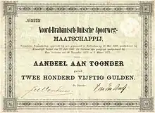 On May 28, 1869, the Noord-Brabantsch-Deutsche Spoorweg-Maatschappij (NBDS) was founded. The purpose of the company was the transport of goods and people on the railways Boxtel - Gennep - Goch - Wesel and Gennep - Kleve. The board of directors of the company was as follows:[2]