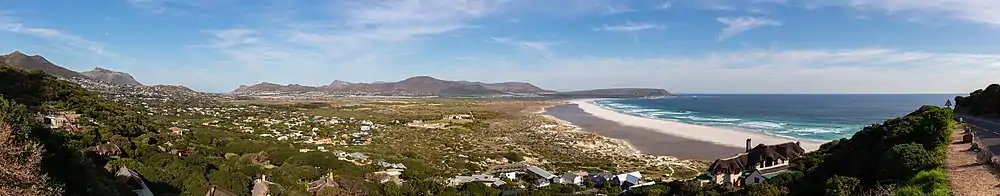 Noordhoek is a seaside town in the Western Cape, South Africa, located below Chapman's Peak on the west coast of the Cape Peninsula and is approximately 35 kilometres (22 mi) to the south of Cape Town. The name "Noordhoek" was taken from Dutch and literally means "north corner". It was given this name in 1743 as being the northern corner of the Slangkop farm. The first permanent resident of European origin is Jaco Malan who built his house there. In 1857, the region was divided into six plots, most of which were bought by a single family, that of the de Villiers. Noordhoek nevertheless remains a predominantly rural area where farmers grow vegetables to supply ships calling at Simon's Town. It is best known for its shoreline and its long, wide, sandy beach, which stretches south to the neighbouring village of Kommetjie. Near the southern end of this beach is the wreck of the steamship "Kakapo", which ran aground in 1900, when the captain mistook Chapman's Peak for the Cape of Good Hope and put the helm over to port.[2]