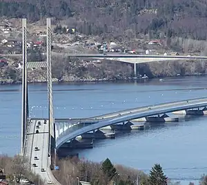 The Nordhordland Bridge (Norwegian: Nordhordlandsbrua) is a combined cable-stayed and pontoon bridge which crosses Salhusfjorden between Klauvaneset (in Bergen Municipality) and the island of Flatøy (in Alver Municipality) in Vestland county, Norway. It is 1,614 meters (5,295 ft) long, of which the pontoon section is 1,246 meters (4,088 ft) long. The cable-stayed section consists of a single 99-meter (325 ft) tall H-pylon which has a length of 368 meters (1,207 ft) and a main span of 172 meters (564 ft). This allows for a clearance of 32 meters (105 ft).
