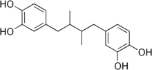 Nordihydroguaiaretic acid (NDGA) is a classic lignan, a phenylpropane dimer linked by a bond between positions C8 and C8′, as opposed to a neolignan. It is a natural compound found in the creosote bush (Larrea tridentata).