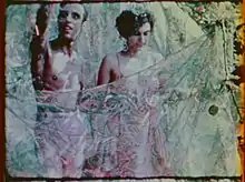 Smith used a pink and green color scheme for Normal Love, giving the film a pastoral quality.[4] He was particularly interested in how Baroque painters like Jean-Antoine Watteau used color.[9] Smith would sometimes paint the animals or foliage where he was filming.[10] He created dense compositions using smoke, vegetation, or fabric that allow the actors to blend into the set design.[4] Much of the film's aesthetic is influenced by White Savage, a 1943 adventure film starring Maria Montez.[6]