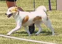 The Norrbottenspets is a small- to medium-sized, compact and robust breed with typical spitz features.[4] Slightly smaller than the Finnish Spitz, the breed standard states dogs should stand between 43 and 47 centimetres (17 and 19 in) with bitches being slightly smaller, standing between 40 and 44 centimetres (16 and 17 in); they typically weigh between 11 and 15 kilograms (24 and 33 lb).[1][2][5] The breed has a thick, dense double coat that protects them well during arctic winters; the outer coat is hard, short and straight whilst the undercoat is fine and dense.[4] The breed can be seen in all colours, although white with red, yellow, cream, tan or black markings is most common; the breed standard states they should be white with either yellow or red patches.[1][4][5] The breed has a wedge-shaped head with erect ears; their body is strong and it is as long as it is tall, with a deep chest.[4] Their tail is long and carried high, curled over their back, as typical of spitz dogs.[4]