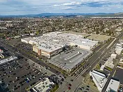 Aerial view of the mall facilities and surrounding environment facing northeast from the corner of North Division St. and Wellesley Ave. Mount Spokane can be seen in the distance.
