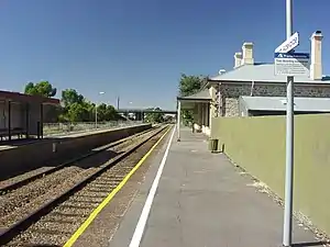There were sidings and a wood yard selling firewood west of this platform where the standard gauge line to Darwin now runs. Special event trains for the annual Skyshow fireworks previously used this station as a terminus. When the Schützenfest is held at the nearby Bonython Park in January each year, most trains stop at this station.[4] In January 2013, North Adelaide station became the temporary terminus of the Gawler Central line while Adelaide station was closed for a month.[5][6] The station is no longer staffed, and the building is owned and managed by the City of Adelaide. In recent times the station building was used for housing a community group, Bicycle SA (1996-circa 2004).