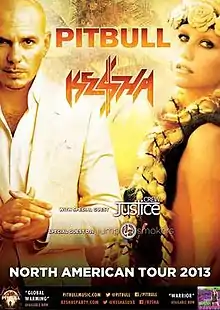The North American Tour 2013 was a co-headlining concert tour by American recording artists Pitbull and Kesha. The tour promoted both Pitbull's album Global Warming and Kesha's album Warrior, which were both released in November 2012. Both Kesha and Pitbull officially announced the trek around North America on Friday, March 22, 2013.[1] Although the tour's official name is the North American Tour, Pitbull and Kesha announced on August 5, 2013 that they are bringing the tour to Australia in late October and early November.[2] The tour started on May 23, 2013 in Boston at the Comcast Center and came to a close on June 26, 2013 in Tampa, Florida at the Live Nation Amphitheatre.