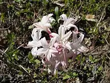 Rhododendron atlanticum, the dwarf azalea, grows on the coastal plain from Georgia to Delaware. It can be found up to 200 miles away from the coast, if the region is sandy, swampy, or dry. These plants can spread by rhizomes if the soil is loose. The flowers can be white or a light pink color, and are fragrant. The flower tubes are the same colors, and are glandular. The pinkish red glands form a line onto each petal tip. Leaf color ranges from gray-green to blue-green. Dwarf azaleas are commonly less than two feet tall. They bloom in the months April and May.[1]