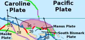 The North Bismarck Plate is a small tectonic plate located in the Bismarck Sea off the northeast coast of New Guinea. It is currently regarded as a relic or inactive plate by most.[3][2] At one time it was called the Manus Plate, but this term was later used for a modelled microplate at the south east boundary of the North Bismarck Plate.[4]:22