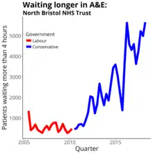 In December 2017, the trust reported 122 breaches of the 12-hour target in A&E the worst performance in England and only 70.3 per cent of patients were seen within the four-hour target.[22] 122 people at Southmead Hospital were left on trolleys in corridors for more than 12 hours during December.[23] In 2017-18, only 77.1% of A&E patients were seen within four hours.[24]