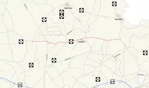 The western terminus of the highway is NC 111. Traveling east 2.5-mile (4.0 km), the highway beings a brief 1.1-mile (1.8 km) concurrency with NC 42 and joins the Tar Heel Trace scenic byway.[2] NC 42 departs the route at the NC 11 intersection, NC 142 continues 1.4-mile (2.3 km) to the rural community of Hassell. Leaving Hassell to the east, NC 142 terminates after 3.7-mile (6.0 km) with the NC 125/NC 903 junction. The Tar Heel Trace continues southbound on NC 125.