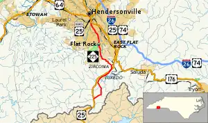 - ↑ Henderson County, North Carolina (PDF) (Map). North Carolina Department of Transportation. September 1, 1999. p. 130. Retrieved February 22, 2016.