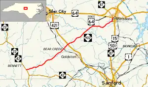 NC 902 begins at NC 22/NC 42 south of Bennett. NC 902 heads east from there and crosses Falls Creek. From there NC 902 turns northeast and goes through Harpers Crossroads at the intersection of Siler City Glendon Road. The road intersects Edwards Hill Church Road (Secondary Road 1141 or SR 1141) on its way to Bear Creek. The road crosses over Bear Creek before reaching the eponymous town about one mile (1.6 km) down the road. When the route finally enters Bear Creek it crosses over a Norfolk Southern railroad and then intersects Old US 421 S.[2] After the road leaves Bear Creek it crosses over Sandy Branch. NC 902 intersects US 421 northeast of Bear Creek and from there continues northeast to cross Landrum Creek. Approximately one mile from the crossing of Landrum Creek, NC 902 turns to the east to parallel US 64. The road turns left on Pittsboro Goldston Road, and starts to again head northeast towards Pittsboro. NC 902 intersects NC 87 just south of downtown Pittsboro and turns north. NC 902 ends at US 64 Business (US 64 Bus.) in downtown Pittsboro.[3][4]